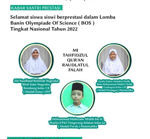 Baca selengkapnya SISWA BERPRESTASI BANIN OLYMPIADE OF SCIENCE TINGKAT NASIONAL TAHUN 2022SALAM YANG BERTEBARAN DI ISRA’ MI’RAJ